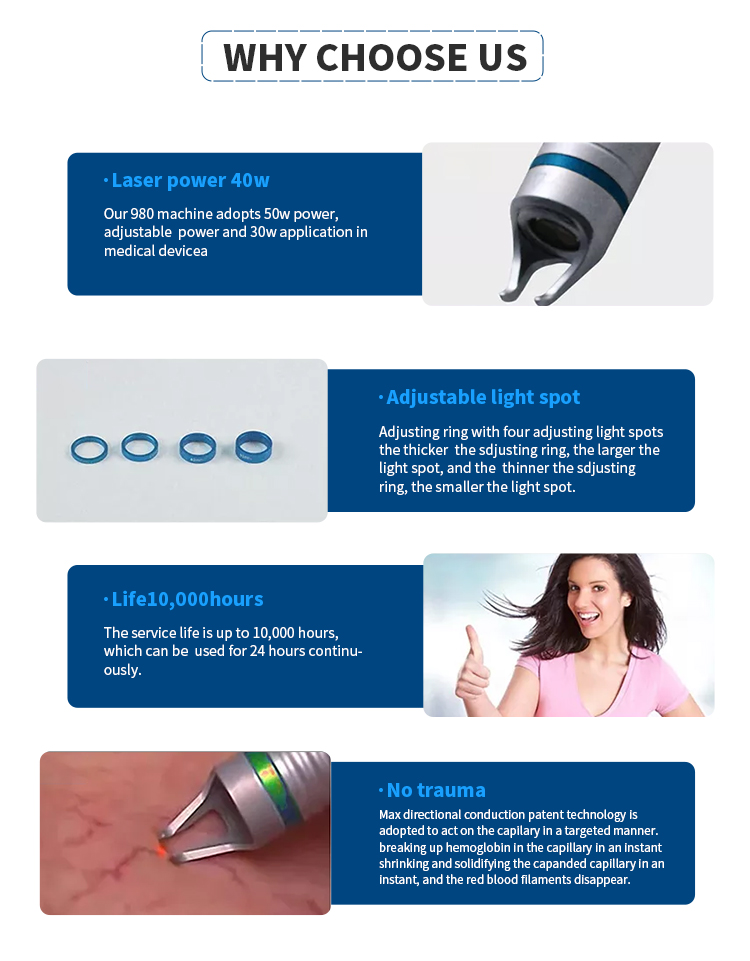 5. **Safety and Precision**: The 980nm laser offers precise targeting of blood vessels without causing significant damage to surrounding tissues. Its high absorption by hemoglobin allows for effective treatment of superficial vascular lesions while minimizing the risk of adverse effects such as scarring or pigment changes.